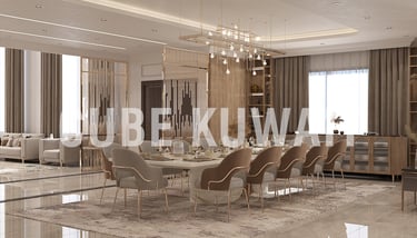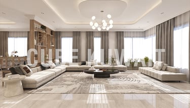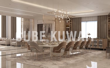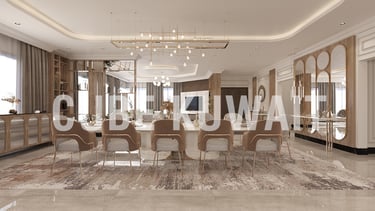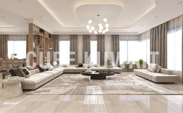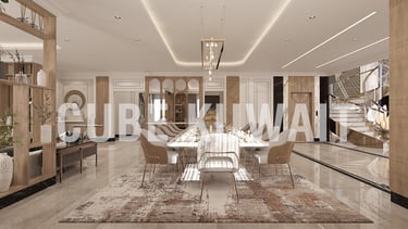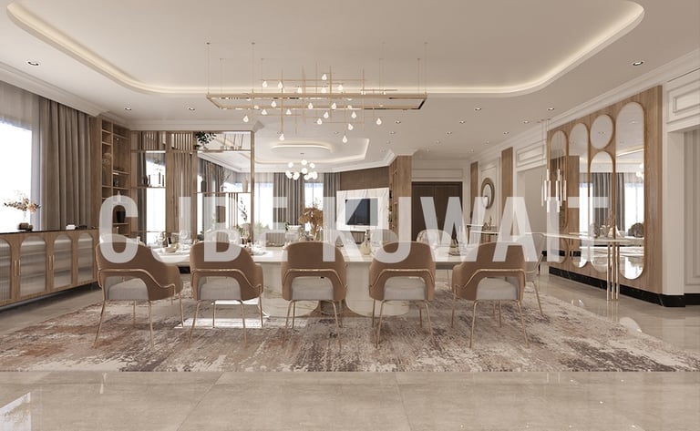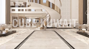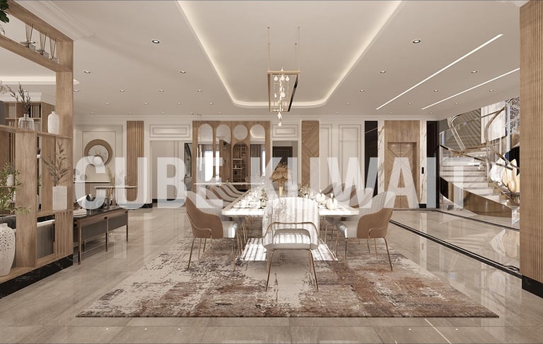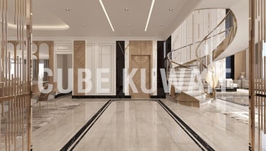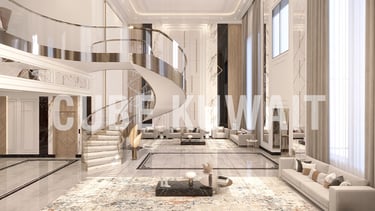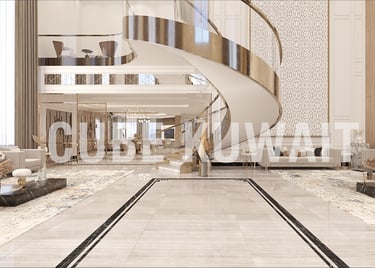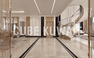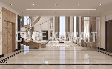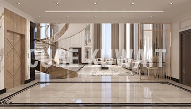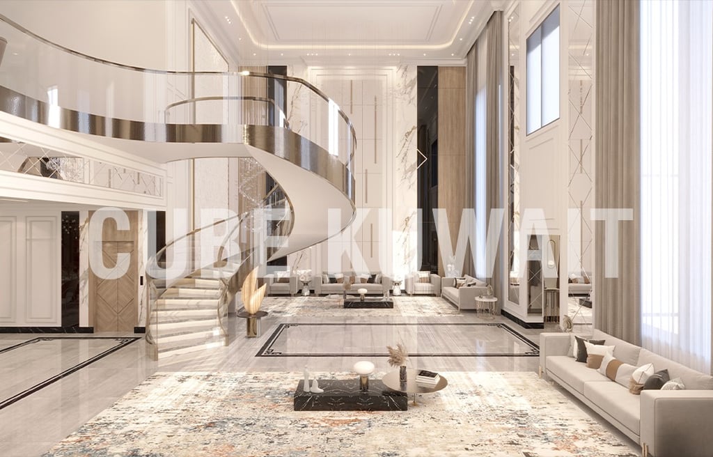 The New Classic design style is characterized by its timeless elegance and modern functionality. The use of double heights in the reception hall not only enhances the visual appeal but also allows for better air circulation and natural light. The neutral color palette creates a calm and sophisticated atmosphere, while the combination of luxurious materials like marble and mirrors add a touch of opulence. The Italian paint and intricate paneling further elevate the aesthetic, making the space both inviting and grand.